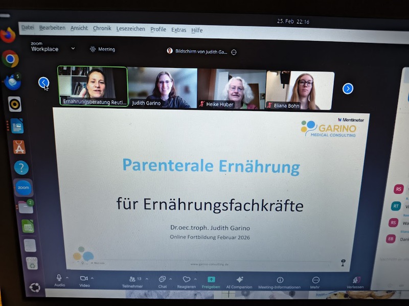 Dr. Judith Garino hat uns (ETZ Tübingen, Ernährungsteam der Reutlinger Klinik und Ernährungspraxis Reutlingen) ein spannendes Update zum Thema "parenterale Ernährung" gegeben und es bleibe Zeit für einen tollen kollegialen Austausch untereinander. Viele chronisch Kranke erhalten eine medizinische Ernährungstherapie - sehr gut begleitet in der Klinik und wir arbeiten intensiv daran, dass auch die Versorgung Zuhause durch qualifizierte Ernährungsfachkräfte mit begleitet wird.
